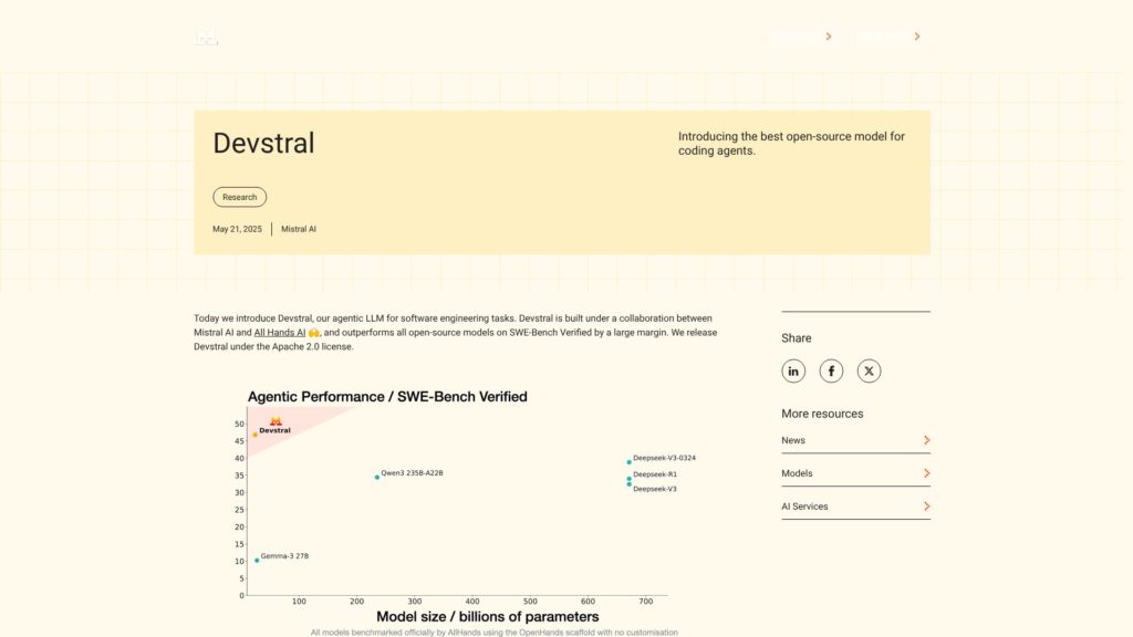 Devstral representa un avance significativo en la oferta de modelos de inteligencia artificial abiertos, destacando por su arquitectura eficiente y capacidad para abordar programación agente con un enfoque moderno y accesible. Para desarrolladores e investigadores, esta familia proporciona una base robusta y altamente flexible que facilita la creación de agentes inteligentes más responsivos y adaptativos en múltiples contextos. Su naturaleza open-source fomenta un ecosistema colaborativo, acelerando la innovación y democratizando el acceso a tecnologías punteras.
